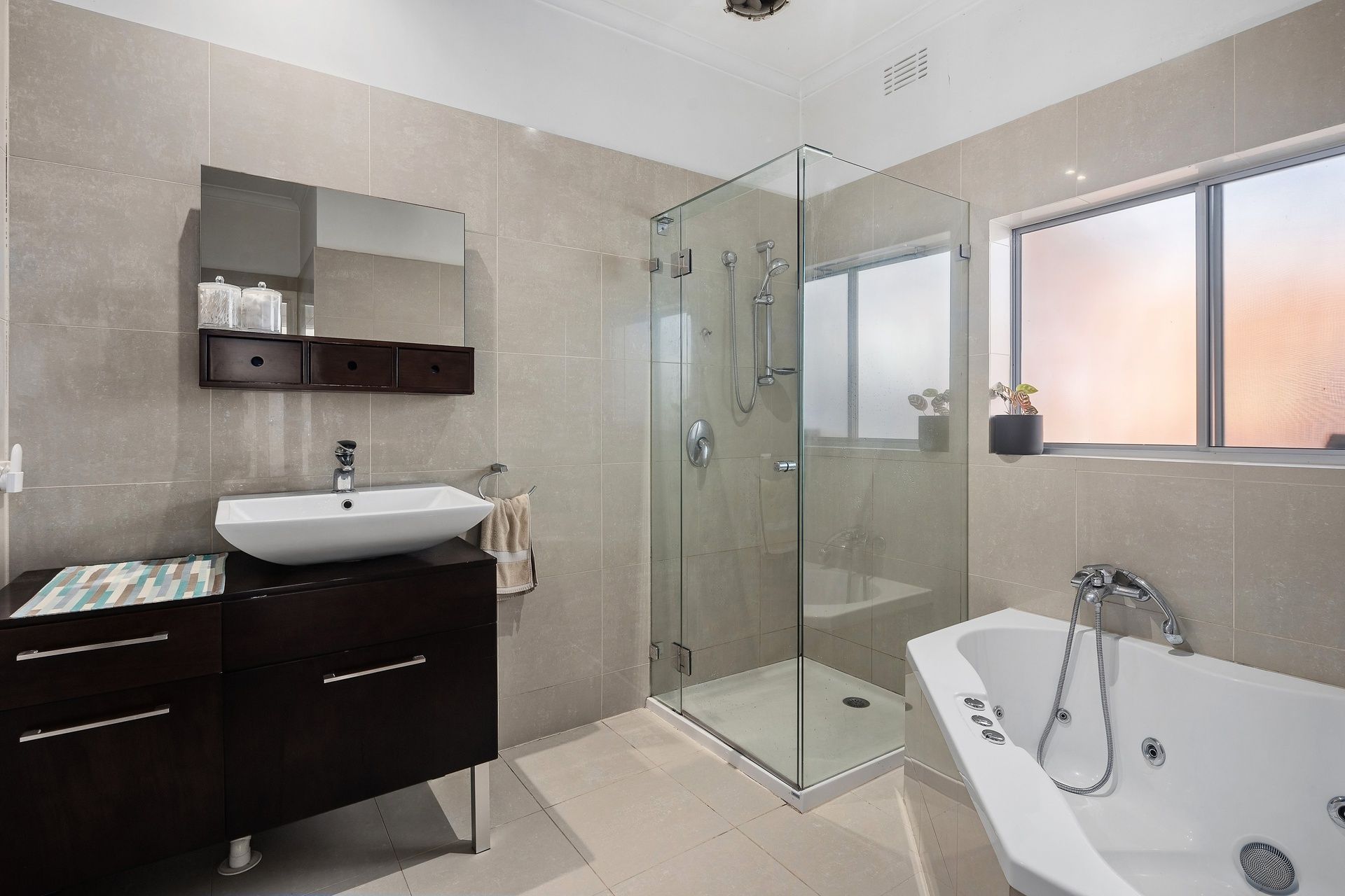 The property features three well-appointed bedrooms, each offering a peaceful sanctuary for rest and relaxation. The master bedroom boasts a large built-in wardrobe, ensuring you have plenty of storage space for all your belongings. The stylish bathroom features a sleek vanity, a luxurious bathtub, and a separate shower, providing a spa-like experience in the comfort of your own home.